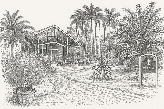 A Casa de Campo foi o lugar escolhido por nós graças a sua linda construção contemporânea feita inteiramente de vidros. O design do lugar é marcado por uma imponente porta de madeira e pé-direito alto, com muita natureza ao redor. Não deixe de observar as lindas jabuticabeiras do salão.